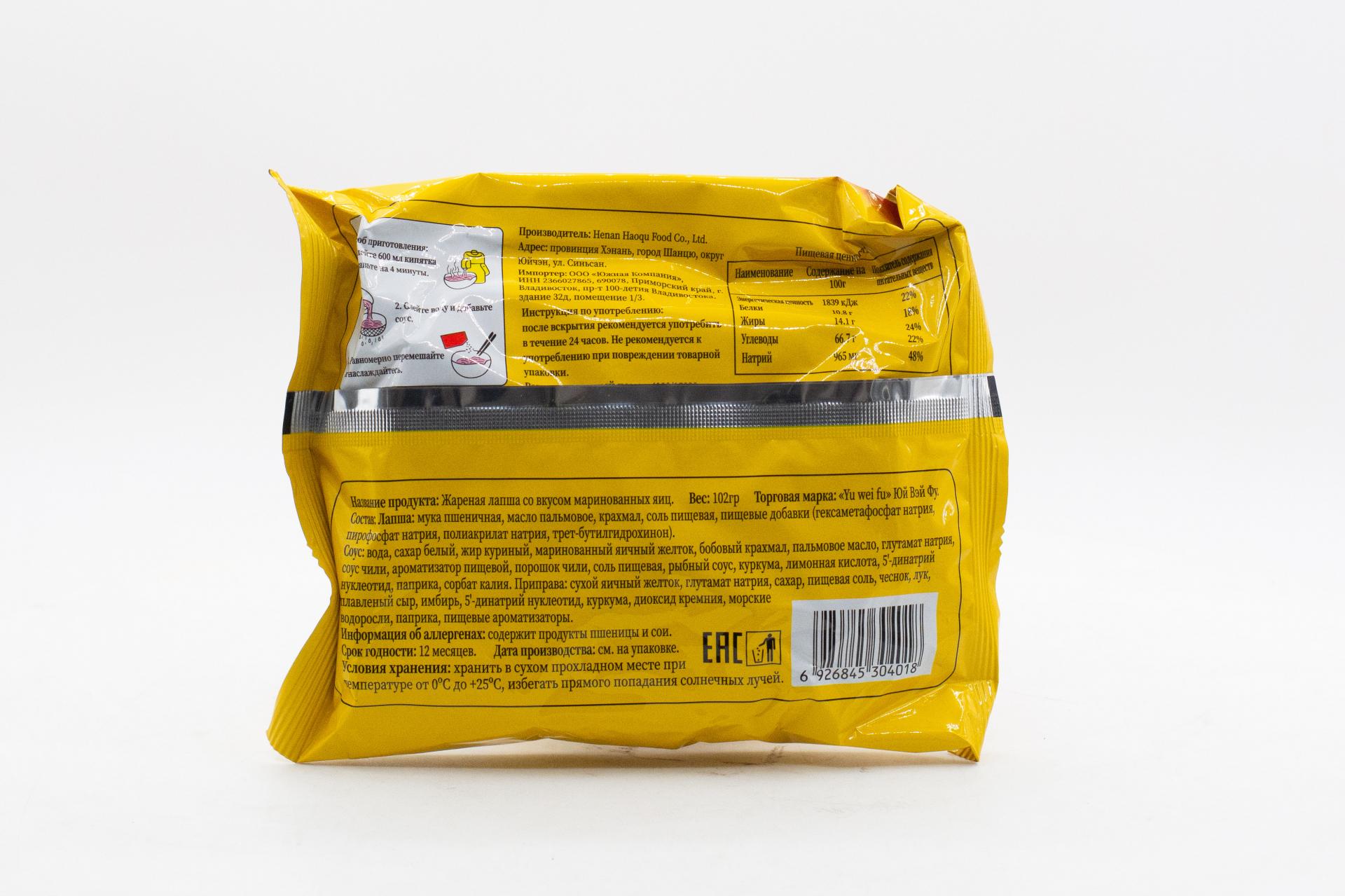 Лапша жареная Юй Вэй Фу со вкусом яйца (Китай) 102г47,50 руб. за штуку (в упак. 5 шт.) |